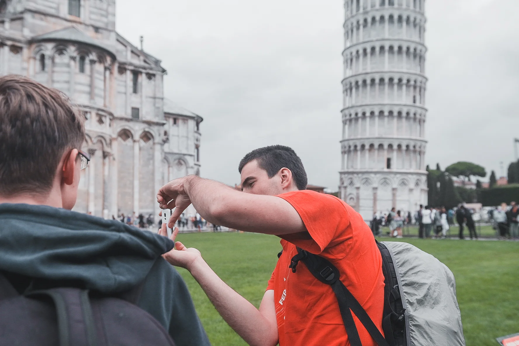 Wir warten im Inneren einen kurzen Regenguss ab, dann mischen wir uns wieder unter die Touristen, die den Turm umringen und für die typischen Fotos posieren. Auch Richard versucht sich daran, muss aber feststellen, dass das gar nicht so leicht ist, wie es aussieht.