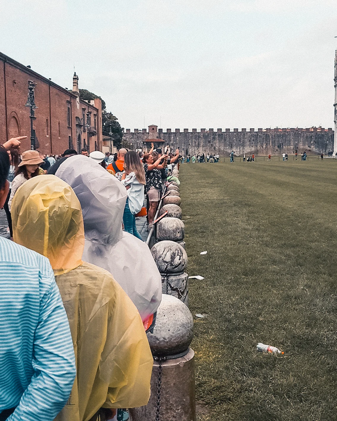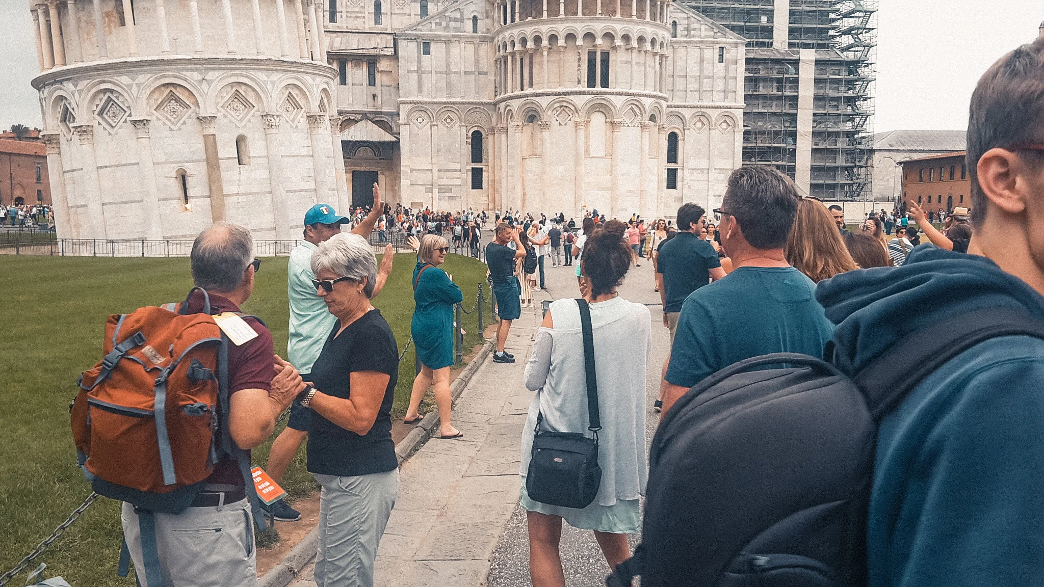 Da mich immer alle vorgewarnt haben, der schiefe Turm sei kleiner, als man ihn sich vorstelle, bin ich davon überrascht, wie groß er ist. Etwa so groß, wie ich ihn mir vorgestellt habe, bevor man mich darüber aufklärte, dass er kleiner sei. Was meine Erwartungen ebenfalls übertrifft, ist der massive Touristenandrang um den Turm herum. Zwar ist das Wetter gerade nicht übermäßig prickelnd, die Luft ist ziemlich schwül und feucht, und es liegt ein Regenguss in der Luft, trotzdem kann man vor lauter Touristen kaum noch treten.