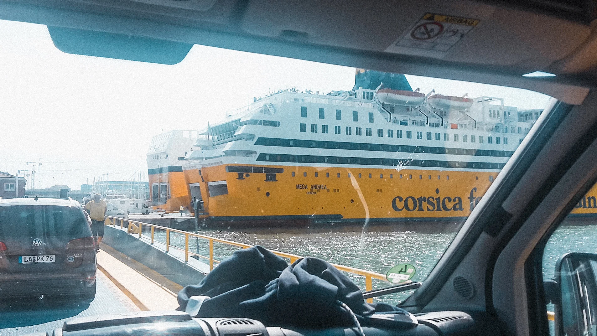 Karl der Mittelgroße ist inzwischen völlig zugeparkt. Mit Ach und Krach kann Richard ihn gerade so aus dem Parkwirrwar und aus der Stadt manövrieren. Gerade pünktlich erreichen wir die Fähre, allerdings lässt man uns noch über eine Stunde warten, bis wir auf unser Schiff, die Mega Andrea, gelassen werden. Die Zeit vertreiben wir uns wieder mit einer seltsamen Fernsehsendung über Anwälte.