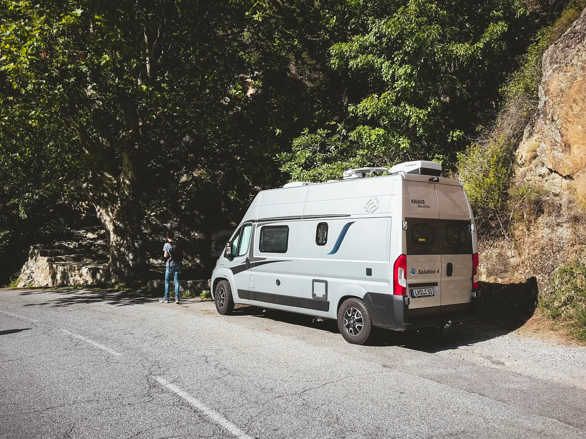 Wir erreichen Karl mit letzter Kraft, zwar war die Wanderung nicht annähernd so anspruchsvoll wie die gestrige Bergbesteigung, aber heute hatten wir fast keinen Schatten, sodass unsere Wasserflaschen leer sind. Entsprechend fallen unsere Reaktionen aus, als wir feststellen, dass Karls Frischwassertank genauso leer ist. Ich erinnere mich dunkel, dass Tim noch heute morgen vorgeschlagen hat, den Wassertank am Zeltplatz mal aufzufüllen, ich das aber mit einem Hinweis auf den üblen Geschmack des Wassers rundheraus abgelehnte. Ungünstigerweise habe ich mich wohl durchgesetzt. Allerdings muss man mir zugutehalten, dass gestern Abend Karl den Inhalt des Tanks noch mit fast halbvoll angegeben hatte. Um das Geschirr mal richtig sauberzukriegen, probierte Tim nach dem Abendessen erstmals das warme Wasser aus (mit mäßigem Erfolg), und in der Tat, im Warmwasserboiler finden sich noch einige Liter lauwarmer Brühe. Eklig, wie Tim findet, und ehe Richard sich ein Urteil bilden kann, ist auch dieser Tank bereits ausgelaugt. Wir parken glücklicherweise neben einer tropfenden Felswand, mit einer Flasche und viel Geduld kann man hier zumindest den gröbsten Durst stillen.